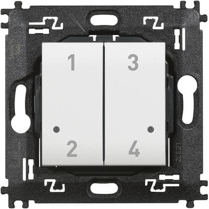 Comando 4 scenari wireless dotato di pulsanti contrassegnati 1,2,3 e 4 per l’attivazione di 4 scenari attivabili e personalizzabili dall’app Home + Control. Installazionesuperficiale con adesivi riposizionabili (forniti a corredo) o su scatole da incassoLED integrato per la segnalazione batteria scarica. Alimentazione a batteria 3V tipo CR2032 (fornita a corredo) con autonomia di 8 anni - 2 moduli.