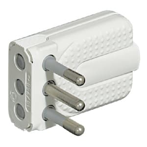 Spina Corner 2P+T 10A salvaspazio con spinotti orientabili di colore bianco. Venduta in blister 90x122 mm (LxA)