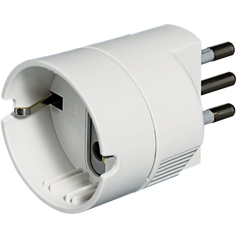 Adattatore con spina 2P+T 10A e presa standard tedesca di colore bianco. Venduto in blister 90x122 mm (LxA)