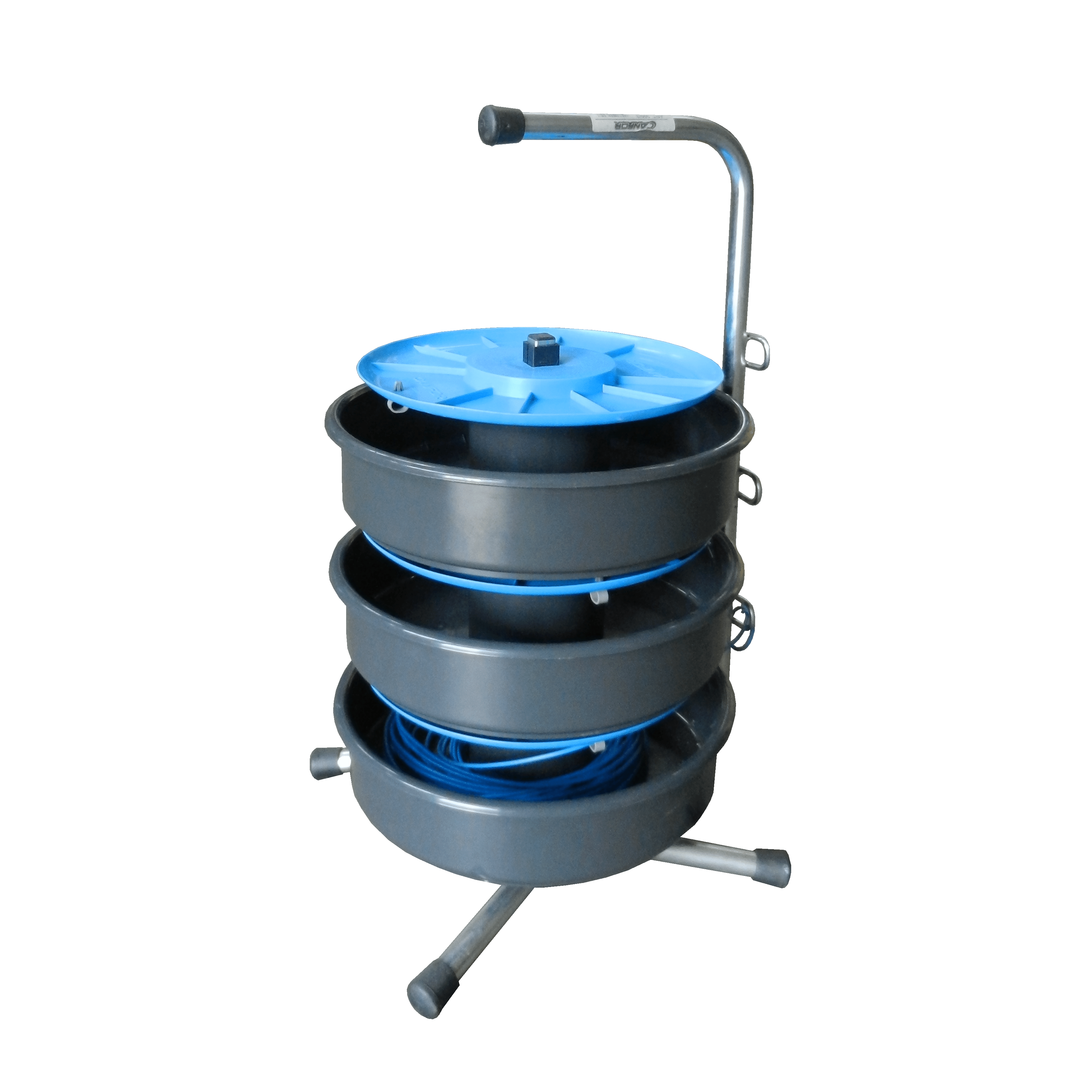 Svolgicavo compatto composto da tre cestelli portamatasse sovrapposti, montati su telaio. Il telaio verticale, realizzato con tubolare Ø 18 mm in acciaio zincato, prevede un manico allungato integrato per il trasporto e tre asole guidafilo. E’ dotato di un albero centrale portamatasse e di quattro gambe d’appoggio con piedini antisdrucciolo per aumentare la stabilità e la resistenza dello svolgitore al tiro dei fili. I cestelli portamatasse Ø 300 mm realizzati in plastica antiurto consentono il contenimento di matasse standard di filo Ø 290 mm. Ciascun portamatasse è girevole sul proprio supporto e prevede il prelievo del filo dalla spira interna della matassa, il cui capo interno va alloggiato nell’apposita guida fissata sotto il coperchio mentre il capo esterno va fissato nel foro previsto sul fondo del cestello. Quest’operazione è fondamentale in quanto il filo risulta protetto dalle dannose torsioni che potrebbero aver luogo dallo svolgimento per trazione del filo della matassa. Successivamente, il filo, passando attraverso l’asola guidafilo prevista sul telaio risulta essere sempre a disposizione dell’operatore. Date le modeste dimensioni, lo svolgicavo può essere comodamente contenuto all’interno del baule di un normale autoveicolo.