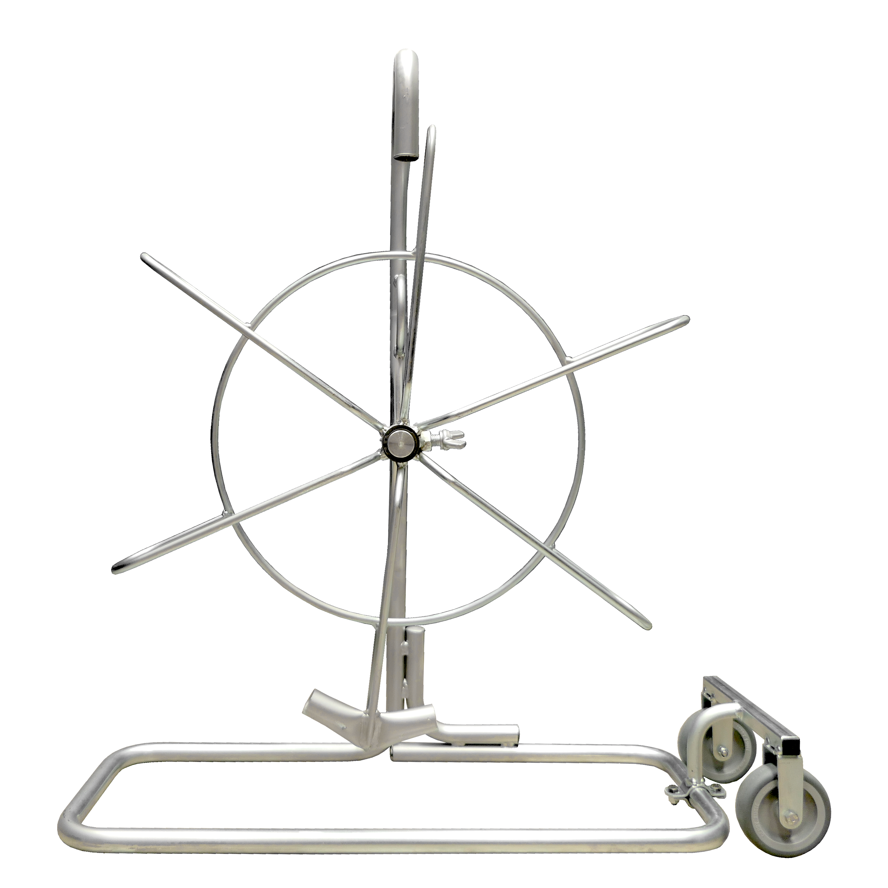 Aspo verticale in acciaio ø 600 mm con ruote. Aspo portasonda su telaio verticale realizzato in tubo d’acciaio ø 20mm zincato dotato di ruote, con praticaimpugnatura per il trasporto. Sul telaio verticale è ricavato un anello guidafilo per consentire un facile svolgimento e riavvolgimento della sonda all’interno del cestello. Sul mozzo del telaio è montato il cestello portasonda di ø 600mm rinforzato da 6 raggi disposti ogni 60° per il contenimento di sonde ad elevata rigidità. Sul cestello è presente un doppio fermo dove alloggiare la testa della sonda, per far sì che quest’ultima sia bloccata e permetta l’inserimento ed il riavvolgimento della stessa all’interno dell’aspo. La presenza del doppio fermo garantisce la possibilità di inserire la sonda nell’aspo in entrambe le possibili direzioni. Sul mozzo centrale sono montati sia due grani filettati M5 per l’alloggiamento degli accessori d’uso, forniti in dotazione alle sonde, sia la vite a nasello che consente di bloccare la sonda alla metratura necessaria. L’art. 651/03R è un valido strumento per l’installatore elettricista. La sonda può esser facilmente svolta tramite semplici operazioni. E’ possibile estrarre la sonda fino alla metratura necessaria e poterla bloccare tramite la vite a nasello. Per procedere con il riavvolgimento della sonda, sbloccare la vite e spingere la stessa all’interno del cestello, che di conseguenza si riavvolgerà. Una volta recuperata la sonda all’interno del cestello, bloccarla chiudendo la vite a nasello. I vantaggi dell’aspo sono: facile svolgimento e riavvolgimento della sonda; evita l’aggrovigliamento delle spire della sonda e preserva la stessa da rotture accidentali; mantiene la sonda sempre in ordine e pronta all'uso. Gli alloggi per gli accessori, costituiti da due perni filettati M5 consentono di avere tutti gli strumenti necessari sempre disponibili e a portata d’uso. Adatto per sonde art. : 155 – 163 – 165 per tutte le metrature. Adatto per sonde art. : 157 fino a 50 metri.
