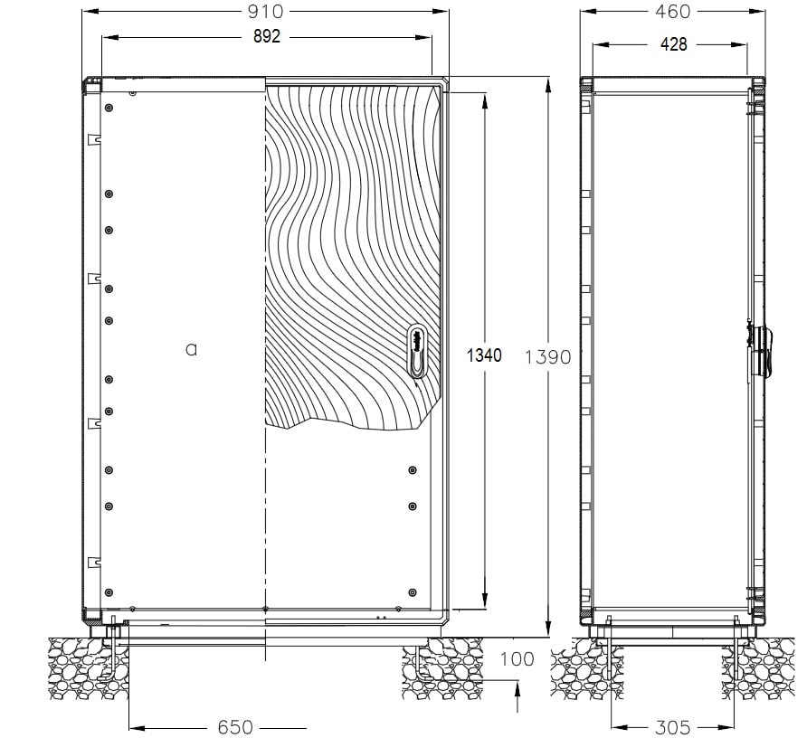 Armadio a 1 vano in vetroresina (SMC) colore RAL 7038. Maniglia in resina termoplastica, tenone di manovra in acciaio zincato; aste e paletti interni in acciaio con trattamento GEOMET 321. Cerniere esterne non accessibili in acciaio inox. Telaio in acciaio zincato e verniciato. Guarnizioni di tenuta realizzate in EPDM espanso. Tensione nominale di isolamento Ui 690V. Completo di telaio di ancoraggio per installazione su basamento in calcestruzzo. Porta incernierata completa di chiusura azionabile con maniglia a scomparsa e serratura di sicurezza a cifratura unica Y21 (cilindro a profi lato DIN18252-a richiesta cifrature personalizzate). Equipaggiabile con piastre di fondo e accessori dedicati per realizzazione quadri. Pareti di fondo munite di borchie predisposte per inserimento di inserti filettati con prigioniero per fissaggio accessori M6 x 20.
