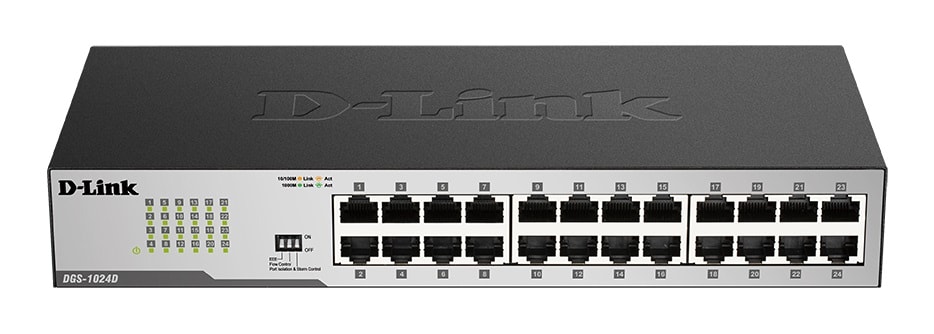 Switch Gigabit Unmanaged 24 porte 10/100/1000Mbps DGS-1024D. Questo switch è dotato di 24 porte Gigabit che garantiscono ai desktop un rapido accesso ai server per fare fronte ai crescenti carichi di rete. L'installazione plug-and-play e le porte Gigabitin rame, collegabili mediante i doppini telefonici di categoria 5 esistenti, migliorano istantaneamente le prestazioni dei gruppi di lavoro senza richiedere l'installazione di costosi cablaggi in fibra ottica o complesse operazioni di riconfigurazione. Tutte le porte supportano connessioni di rete a 10/100/1000Mbps con funzioni di individuazione e negoziazione automatica della modalità full/half duplex.