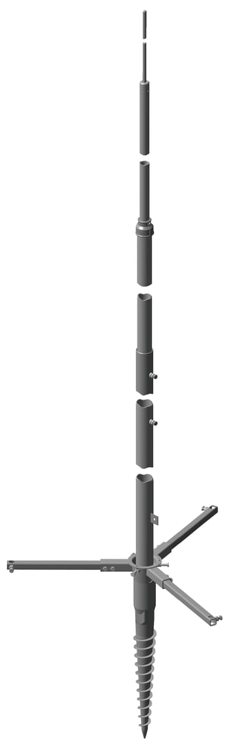 Palo componibile di captazione con fondazione filettata, provato secondo CEI EN 62561-(1+2). Per la protezione da scariche dirette di impianti particolari, come p.es. impianti biogas, campi fotovoltaici a terra. I pali componibili di captazione con fondazione filettata sono dimensionati conformi all'Eurocode per raffiche di vento max. 225 km/h. I pali vengono montati avvitando la trivella nel terreno. Non sono necessari né lavori di scavo, né la realizzazione di fondazioni in cemento. La fondazione filettata può essere avvitata nel terreno senza preparazioni particolari. È da fissare con ulteriori dispersori di profondità. Esecuzione altezza sopra terra 6000 mm.
