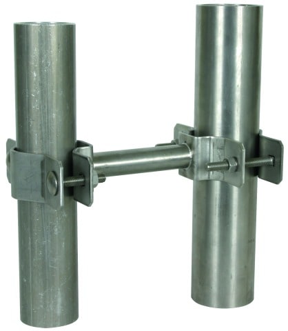 Fissaggio per ringhiere per il fissaggio di tubi portanti (D50 mm) o di aste di captazione (D40 mm) ad es. su tubi. Esecuzione con elemento distanziatore lunghezza 95 mm per bilanciare ad es. le staffe delle antenne.