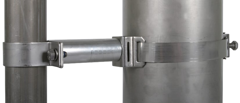 Fascetta di fissaggio con nastro tenditore, per il montaggio di tubi portanti DEHNiso-Combi, p.es. su pali d'antenna oppure altre tubazioni. Esecuzione con elemento distanziatore, lunghezza 95 mm, per poter compensare gli elementi di fissaggio di antennesu pali.