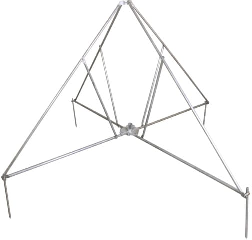 Quadripode (versione pieghevole) per tubi portanti D 50 mm con uscita laterale o asta di captazione D 40 mm con accessorio riduttore. Con cavallotto doppio di fissaggio per la connessione di 2 x Td 8-10 mm, per l?applicazione con zoccolo in cemento (peso17 kg) con adattamento all?inclinazione del tetto fino a un massimo di 10? mediante set di supporto per lo zoccolo.