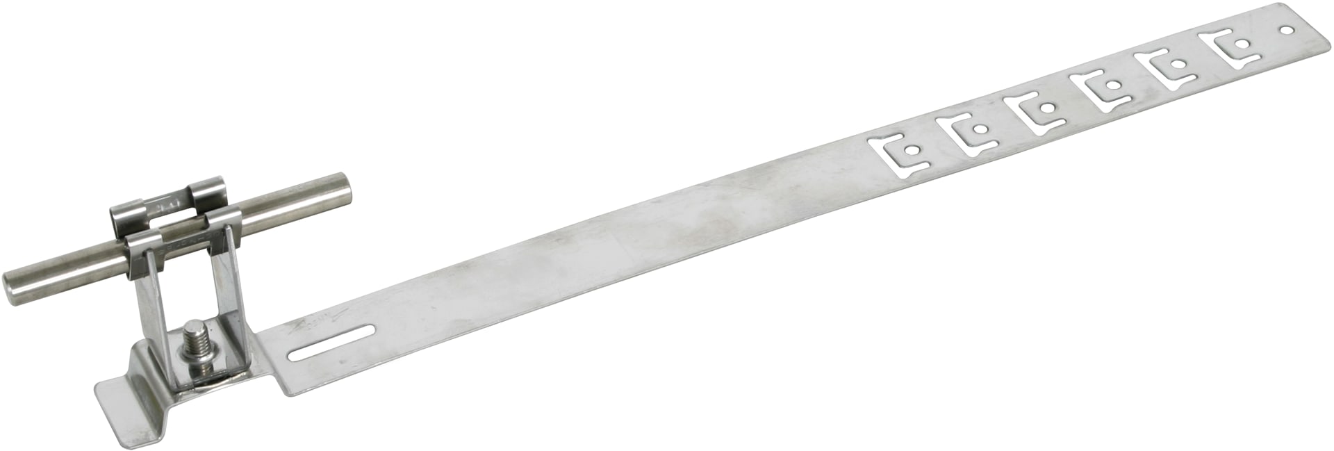 Staffa portafilo per tetti UNIgrip con montante punzonato per il fissaggio di captatori e calate per tetti piani. Esecuzione con punti di piegatura predisposti per l'adattamento e l'agganciamento alle tegole/pietre oppure ai listelli, con staffa portafilo DEHNgrip altezza 20 mm, posa libera del conduttore.