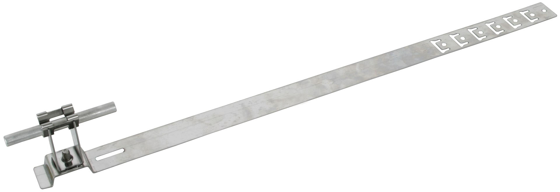 Staffa portafilo per tetti UNIgrip con montante punzonato per il fissaggio di captatori e calate per tetti piani. Esecuzione con punti di piegatura predisposti per l'adattamento e l'agganciamento alle tegole / pietre oppure ai listelli, con staffa portafilo DEHNgrip altezza 32 mm, posa libera del conduttore.