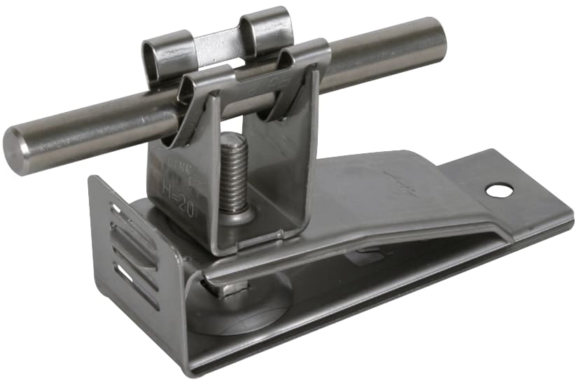 Staffa portafilo per tetti DEHNgrip per materiale bituminoso per il fissaggio di captatori e calate per coperture. Esecuzione con morsetto per il fissaggio su lamiere per coperture e pareti, con staffa portafilo DEHNgrip, posa libera del conduttore.