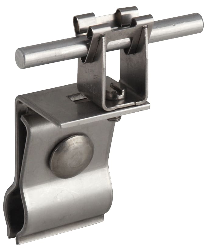 Staffa portafilo per tetti per il fissaggio di dispositivi di captazione come captatori su tetti metallici. Esecuzione per tetti con scanalatura verticale arrotondata, con staffa portafilo DEHNgrip, posa libera del conduttore.