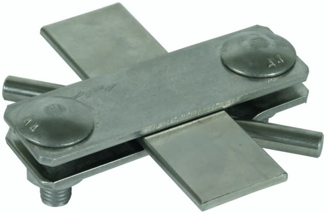Morsetto di collegamento obliquo secondo CEI EN 62561-1, per collegamenti a croce e a "T"di conduttori tondi e piatti (larghezza fino a 40 mm). Esecuzione con antisvitamento delle viti M10.