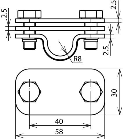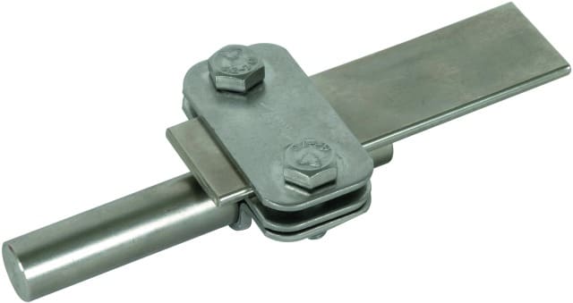 Morsetto di sezionamento UNI secondo CEI EN 62561-1 per il collegamento della calata con l'adduzione a terra. Esecuzione con piastra intermedia per conduttori tondi e piatti.