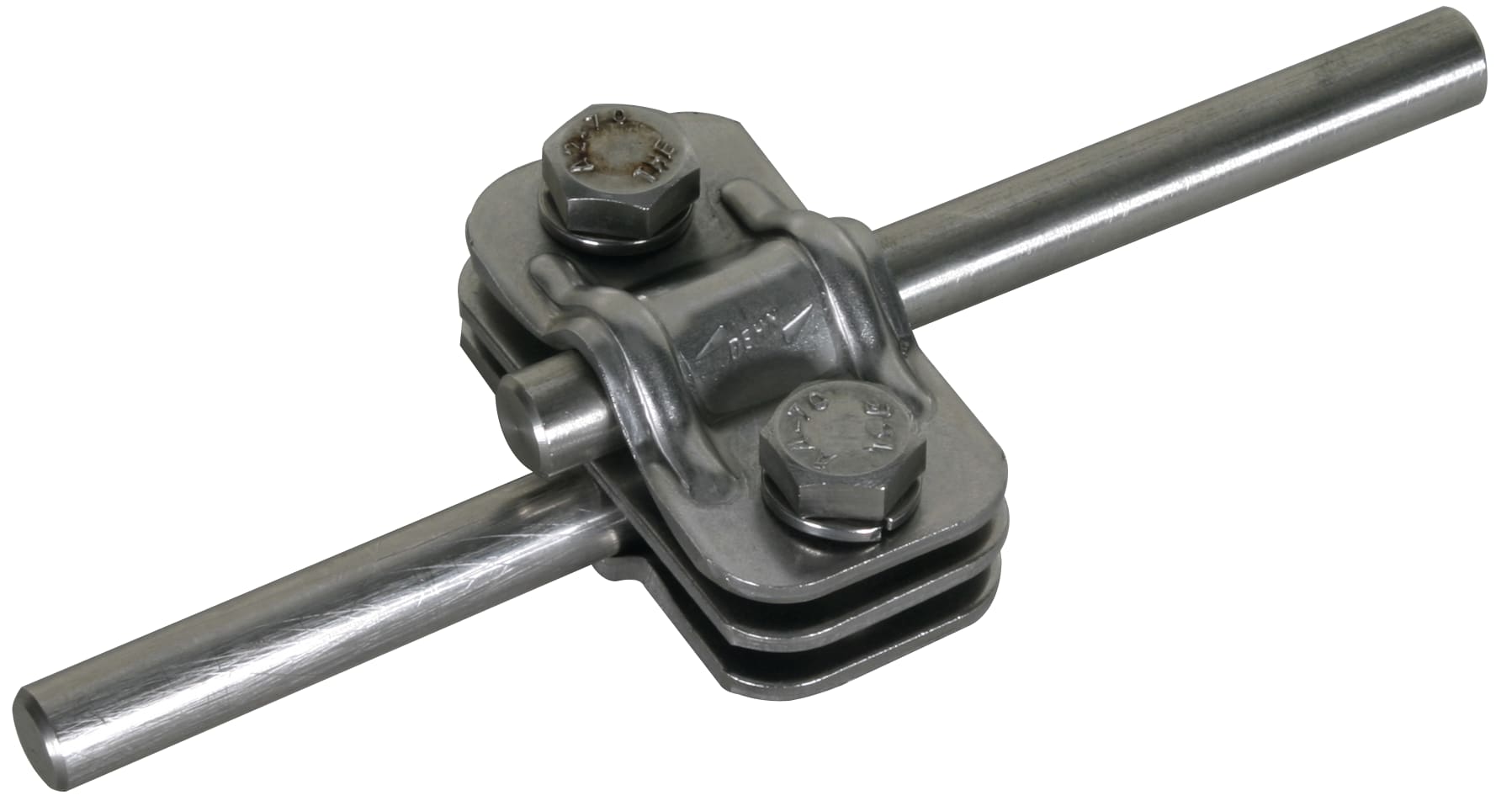 Morsetto di sezionamento per collegare un'asta di captazione o un'adduzione a terra con un conduttore tondo. Portata di corrente di fulmine provata fino a 200 kA (10/350 µs) in conformità alla CEI EN 62561-1. Esecuzione con grova e piastra intermedia perconduttori tondi e piatti.