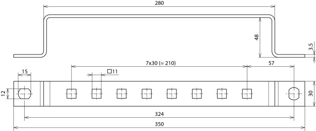 Barra di messa a terra da avvitare su costruzioni di acciaio. Per il collegamento di conduttori piatti con foro o conduttori tondi con ad es. connettore KS. Esecuzione con connessioni / fori 1x 8 D11 x 11mm.