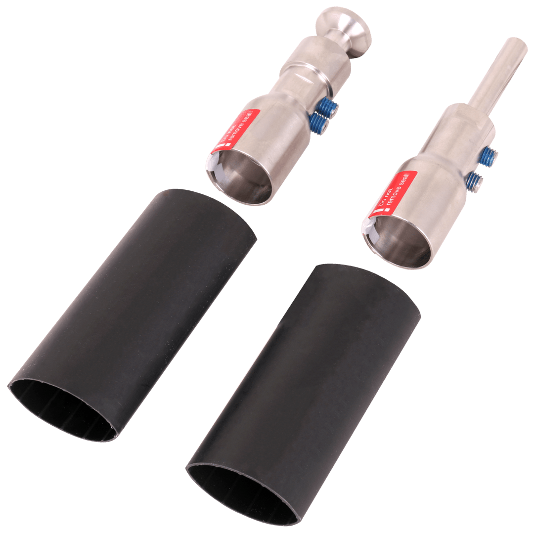 Elementi di connessione per la terminazione della conduttura HVI power long su entrambe le estremità, nella realizzazione del terminale della conduttura nel tubo portante (elemento terminale) ed elemento di connessione per collegare altri componenti della protezione da fulmini esterna o dell'impianto di messa a terra (due tubi termorestringenti compresi nella confezione).