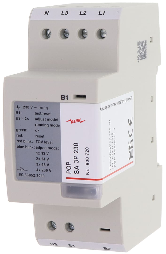 Dispositivo di monitoraggio per sovratensioni temporanee, per il collegamento a un dispositivo esterno di protezione contro la sovracorrente Per impianti in cui la protezione dalle sovratensioni transitorie e gia garantita da altri dispositivi. Soddisfa i requisiti della norma CEI EN 63052 (CEI 23-118) cat. 4.1.3. Segnale attivatore in uscita regolabile da 12 a 230 V.