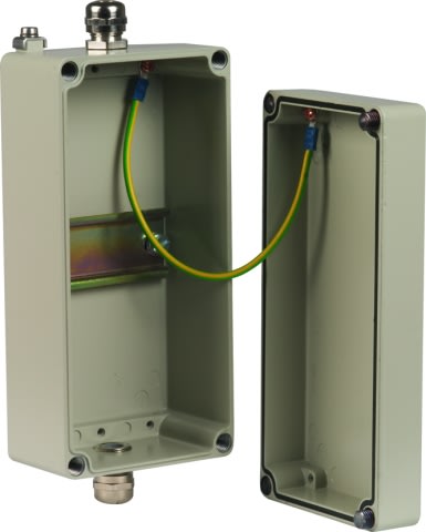 Custodia in alluminio, installazione a parete IP65, per il montaggio di apparecchi modulari. Con 2 pressacavi in ottone M20. Larghezza160/altezza100/profondità85mm