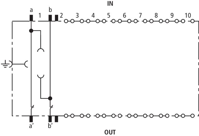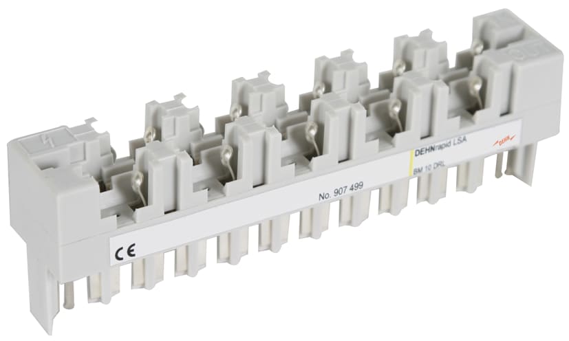 Blocco di protezione (senza scaricatori) per il contenimento da 1 fino a 10 scaricatori a gas GDT 230 B3... Inoltre adatto per l’assemblaggio con spine di protezione DRL tramite telaio di messa a terra.