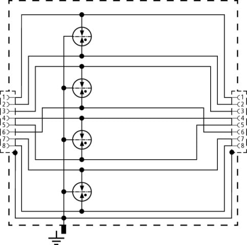 Limitatore di sovratensione universale per Ethernet, Power over Ethernet (conforme a IEEE 802.3 fino a PoE++ / 4PPoE) ed applicazioni simili in sistemi di cablaggio universale della Classe D fino a 100 MHz. Protezione di tutte le coppie di fili mediante potenti scaricatori a gas. Adattatore con prese di collegamento e per il montaggio su guida profilata.