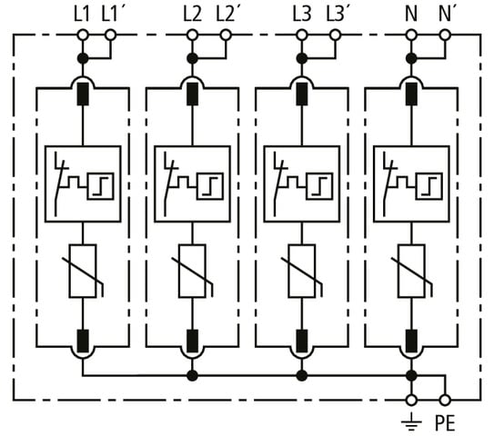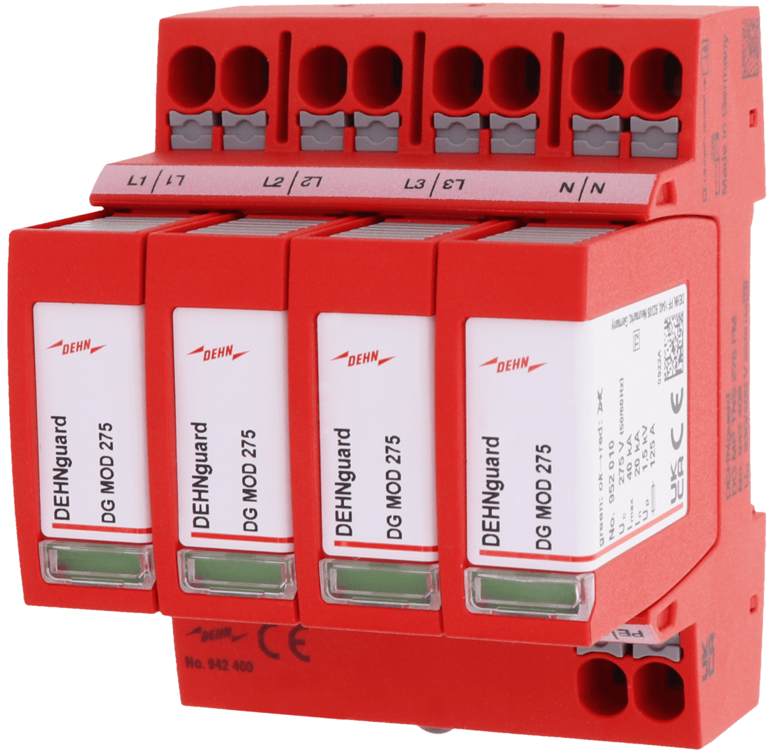 Limitatore di sovratensione multipolare DEHNguard MP, tipo 2 + tipo 3 secondo la norma EN 61643-11, costituito da basetta con moduli di protezione a innesto e doppio morsetto di collegamento Push-in adatto a cablaggio in derivazione e passante a "V"Elevata sicurezza dell?apparecchio tramite l?unita di monitoraggio con Thermo-Dynamic-Control. Per proteggere da sovratensioni gli impianti elettrici utilizzatori in bassa tensione. Per l?impiego nel concetto di protezione da fulminazione a zone nelle interfacce 0B ? 1 e superiori.