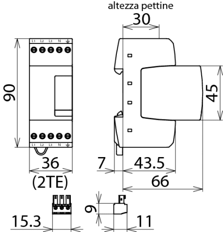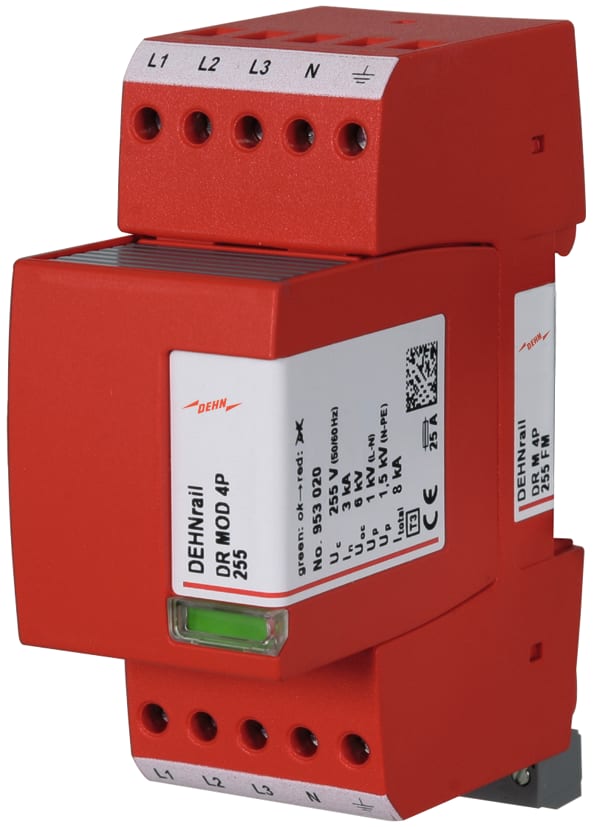 Limitatore di sovratensione tetraipolare DEHNrail modular, Tipo 3 sec. CEI EN 61643-11, composto da elemento base e modulo di protezione innestabile. bestehend aus Basiselement und gestecktem Schutzmodul. Elevata capacità di scarica tramite combinazione di potenti varistori all'ossido di zinco / spinterometri. Per la protezione di reti di alimentazione da sovratensioni transienti in quadri elettrici. di apparecchi industriali transitorie in quadri elettrici. Per l'impiego nel concetto di protezione da fulminazione a zone, ai passaggi 1 - 2 e maggiori.