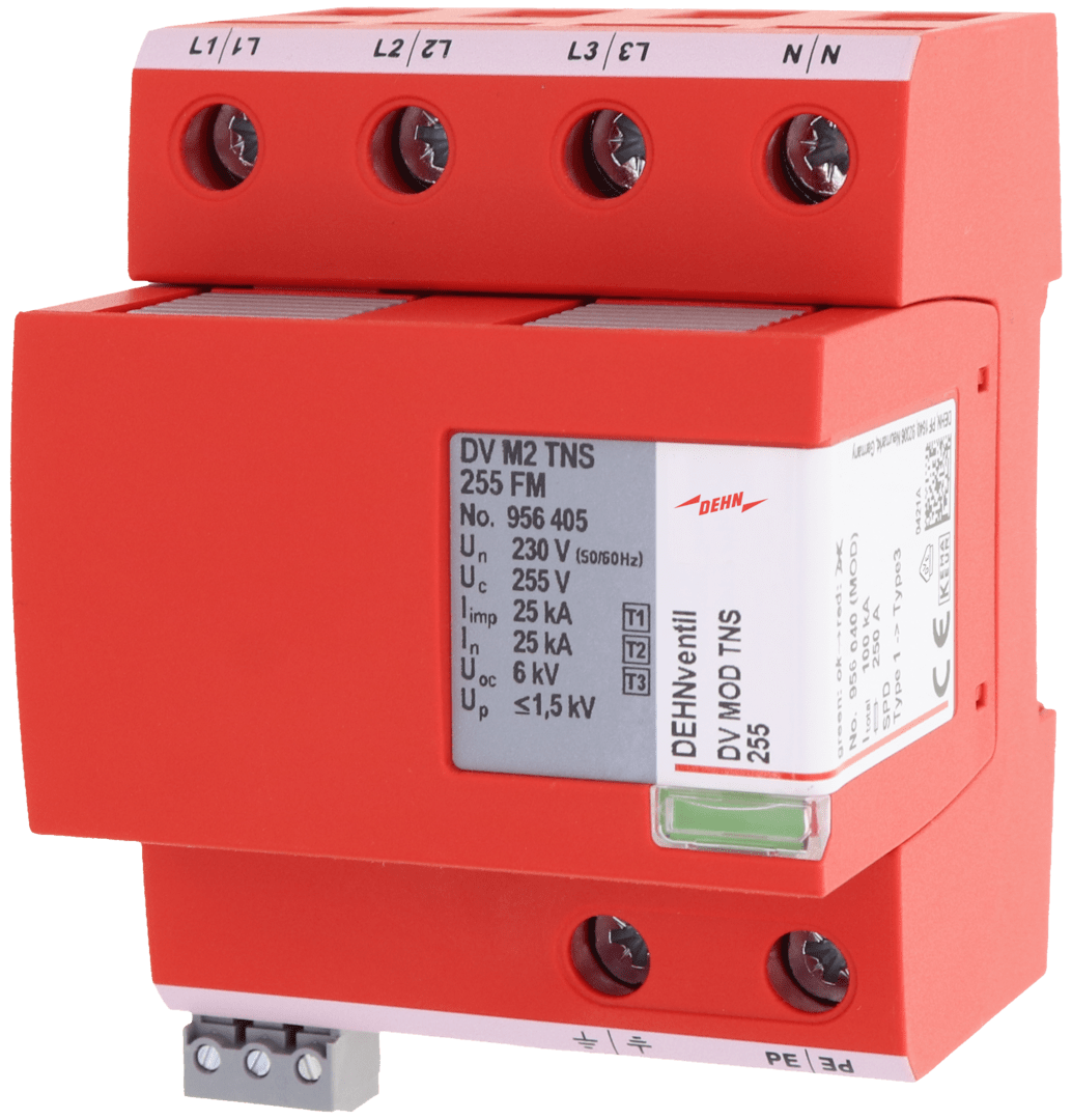 Scaricatore combinato multipolare DEHNventil modular, SPD Tipo 1 + Tipo 2 + Tipo 3 in accordo a EN 61643-11 (CEI EN 61643-11, CEI 37-8) su base spinterometrica, composto da elemento base e un modulo di protezione innestabile.Elevatissima continuita di servizio tramite spinterometri Rapid Arc Control (RAC). Permette la protezione di utenze finali. Per la protezione da sovratensioni di impianti elettrici utilizzatori in bassa tensione, anche in caso di fulminazione diretta. Per l'impiego nel concetto di protezione da fulminazione a zone, ai passaggi 0A - 2.