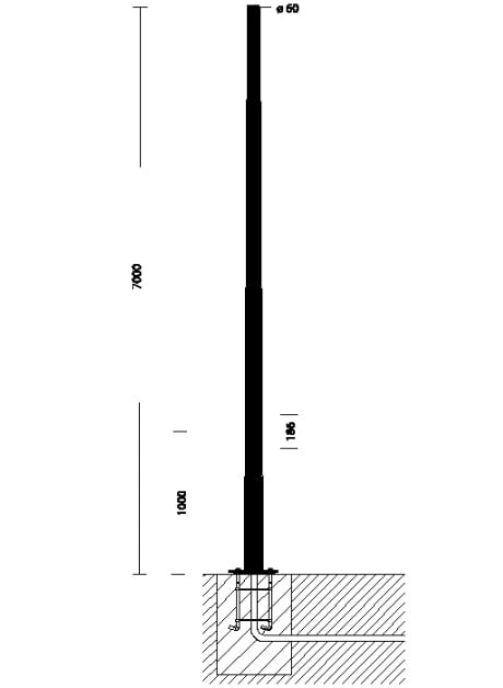 1480 palo conico in acciaio con base. Pali in acciaio laminato a caldo e privo di saldature. Predisposto con foro per ingresso cavo di alimentazione, con attacco testa palo ø60. Per la versione con base è necessario acquistare 4 tirafondi da interrare, bulloneria e tappi. Completo di un portafusibile di protezione, 2 fusibili da 16A, morsettiera asportabile 4 poli/3 vie = 10mmq e derivazione 2,5mmq. Di serie in classe di isolamento II. Attenzione quando si utilizzano apparecchi in classe di isolamento I prevede le connessioni per la messa a terra. N.B.: La possibilità di accoppiare una composizione al palo è subordinata alla verifica della resistenza alla spinta del vento, nelle zone del territorio previste dalla norma D.M.14/01/2008. Secondo le ipotesi di carico previste dalle norme EN 40-3-1. Colore: grafite. Dimensione: 7000mm.