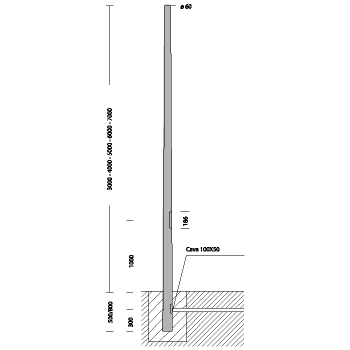 Pali in acciaio laminato a caldo e privo di saldature. Predisposto con foro per ingresso cavo di alimentazione, con attacco testa palo ø60. Per la versione con base è necessario acquistare 4 tirafondi da interrare, bulloneria e tappi. Dimensioni finestradi ispezione 38x132 (h 3000) - 45x186 (h 4000-5000-6000), completo di un portafusibile di protezione, 2 fusibili da 16A, morsettiera asportabile 4 poli/3 vie = 10mmq e derivazione 2,5mmq. Di serie in classe di isolamento II. Attenzione quando si utilizzano apparecchi in classe di isolamento I prevede le connessioni per la messa a terra. N.B.: La possibilità di accoppiare una composizione al palo è subordinata alla verifica della resistenza alla spinta del vento, nelle zone del territorio previste dalla norma D.M.14/01/2008. Secondo le ipotesi di carico previste dalle norme EN 40-3-1