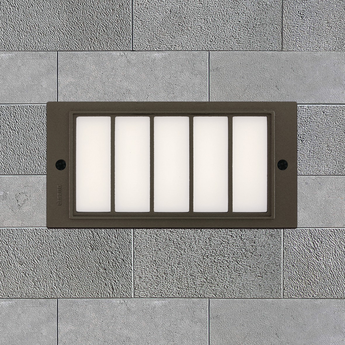 CORPO: In nylon, infrangibile stabilizzato ai raggi UV. Completo di griglia lineare verticale. CORNICE: In alluminio pressofuso. DIFFUSORE: In plexiglas opale. VERNICIATURA: Ad immersione per cataforesi epossidica, resistente alla corrosione e alle nebbie saline e finitura bugnata con vernice acrilica. PORTALAMPADA: In policarbonato bianco e contatti in bronzo fosforoso attacco G23. In ceramica attacco E14. CABLAGGIO: Alimentazione 230V/50Hz. Cavetto rigido sezione 0.50 mm² e guaina di PVC-HT resistente a 90°C secondo le norme CEI 20-20. Morsettiera 2P con massima sezione dei conduttori ammessa 2.5 mm². NORMATIVA: Prodotti in conformità alle vigenti norme EN60598-1 CEI 34-21 e sono protetti con il grado IP54IK08 secondo le EN 60529 e sono certificate dall'Istituto del Marchio di Qualità (IMQ) ed hanno ottenuto la certificazione di conformità Europea ENEC. In classe di isolamento II.