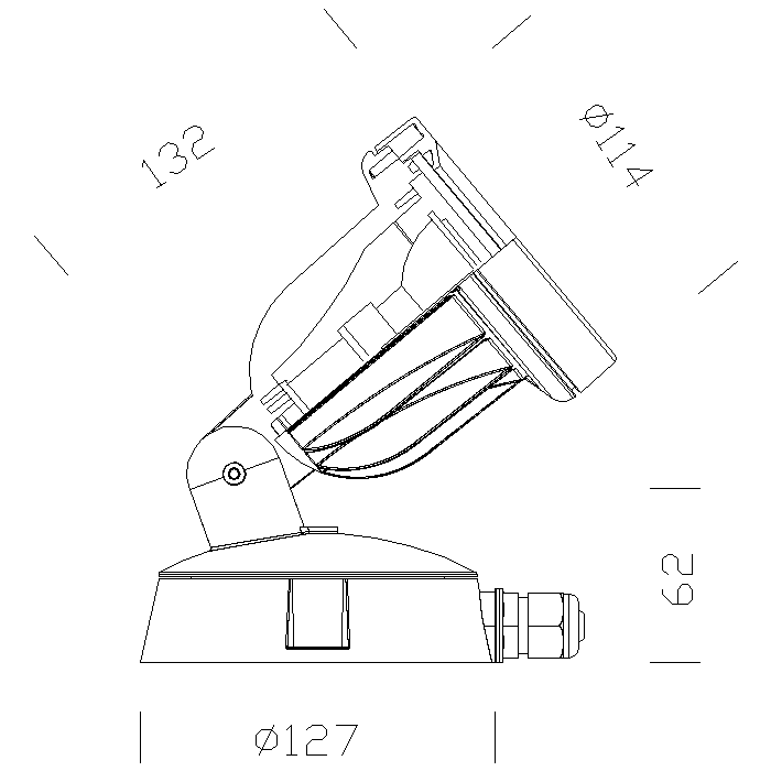 CORPO/TELAIO: In alluminio pressofuso, con ampie alettature di raffreddamento per un elevato smaltimento termico. BASE: In nylon f.v., infrangibile. DIFFUSORE: In vetro serigrafato, temperato. VERNICIATURA: In diverse fasi. Ad immersione in cataforesi epossidica, resistente alla corrosione e alle nebbie saline. La seconda con fondo per stabilizzazione ai raggi UV e per ultima finitura bugnata con vernice acrilica, argento metallizzato. PORTALAMPADA: In ceramica e contatti argentati. CABLAGGIO: Alimentazione a 230V. Cavetto in silicone con calza vetro sezione 1mm². Morsettiera 2P con massima sezione dei conduttori ammessa 2.5 mm². EQUIPAGGIAMENTO: Pressacavo diam. 3/8. NORMATIVA: Prodotte in conformità alle vigenti norme EN60598-1 CEI34-21 sono protette con il grado IP65IK08 secondo le EN 60529. Hanno ottenuto la certificazione di conformità Europea ENEC. Installabili su superfici normalmente infiammabili. In doppio isolamento. Funzionamento a tensione di rete senza trasformatore.