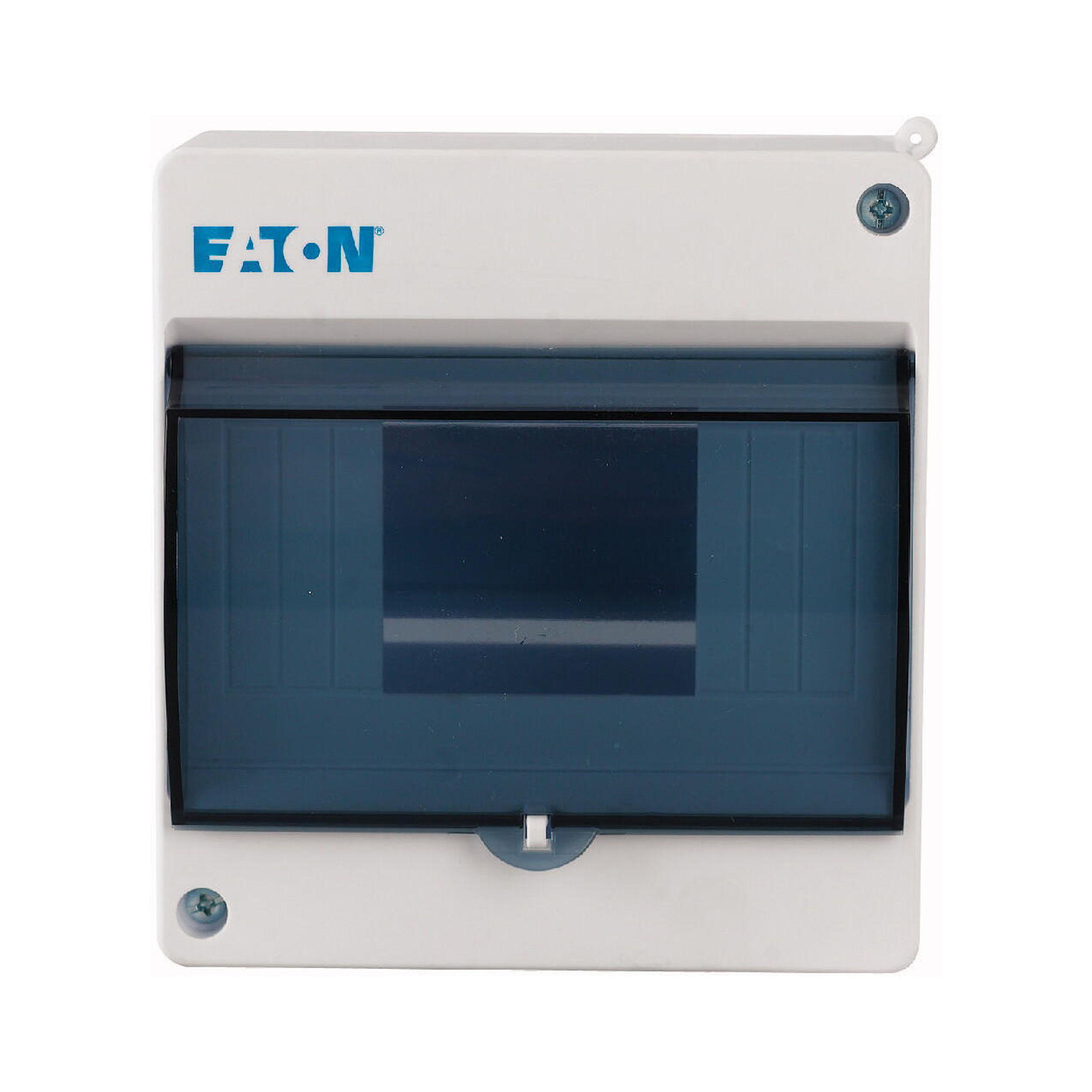 Quadro di distribuzione compatto mini di plastica, con porta trasparente, per l’installazione di dispositivi di commutazione e di protezione, in conformità agli standard sulle dimensioni DIN 43 880, con una profondità di installazione di 70 mm e una corrente fino a 63 A, 400 V /50 Hz, Grado di protezione IP30 fino a IEC/EN 62208, approvato per quadri di distribuzione di servizio in conformità alle norme IEC/EN 61439-3, per montaggio a vista, parte superiore con apertura dispositivo da 46 mm, sigillabile di serie, base e coperchio bianchi con chiusura a vite, pre-forato per ingressi cavi a passo metrico sulla parte superiore 2x M20, inferiore 2x M20, bilaterale 2x M20 e posteriore 4x M20, classe di isolamento II, 6 unità passo.