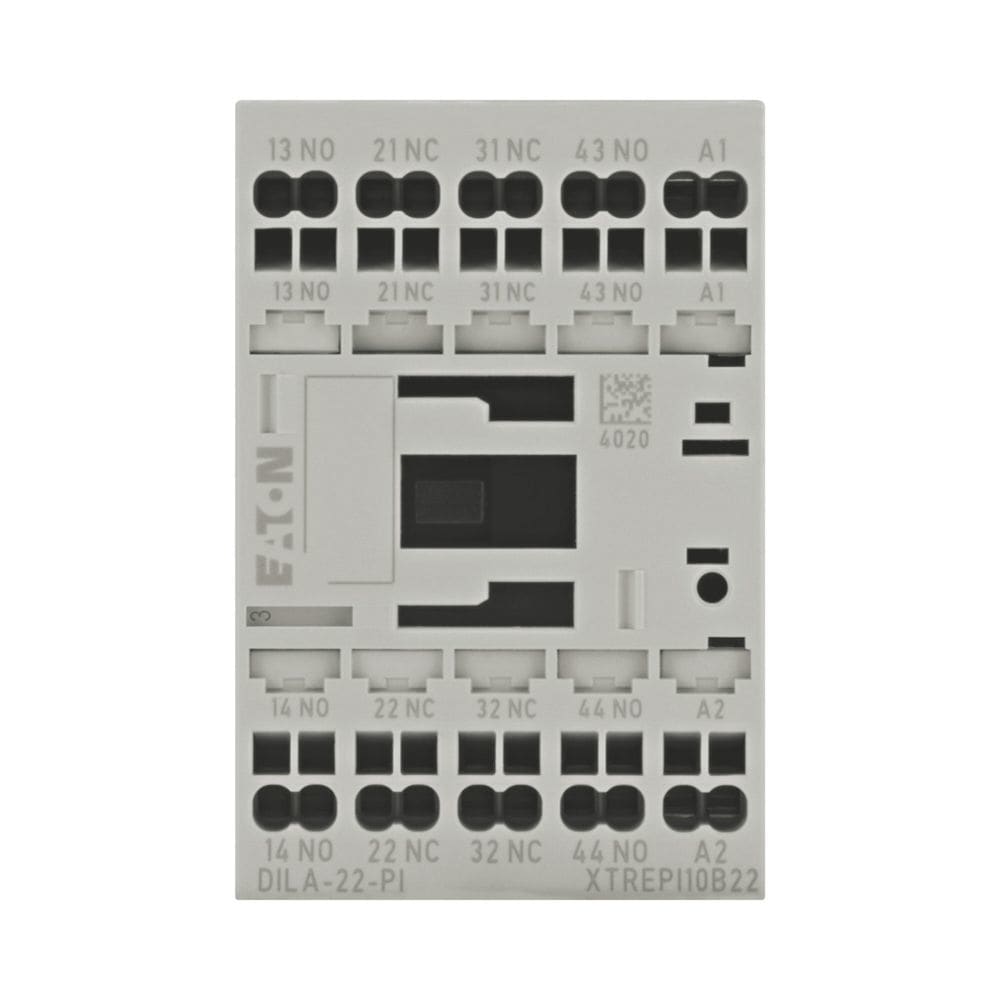 Contattori ausiliari DILA, Apparecchi base con contatti a guida forzata, Morsetti Push-In, Corrente nominale d'impiego Ie/AC-15: 220 V 230 V 240 V = 4 A, 380 V 400 V 415 V = 4 A, NA = norm. aperto: 2 contatto NA, NC = norm. chiuso: 2 contatto NC, Numero di identificazione: 22E, Possibilità di combinazione con modulo contatti ausiliari DILA-XHI(V)…-PI, Tensione di comando: 24 V DC, Tipo di corrente AC/DC: Comando in corrente continua, Organi di contatto secondo EN 50011., Identificazione del collegamento della bobina secondo EN 50005, Circuito di protezione integrato., circuito di protezione a varistore integrato Grado di protezione: IP20, Conformità alle norme: IEC/EN 60947, EN 60947-5-1, VDE 0660