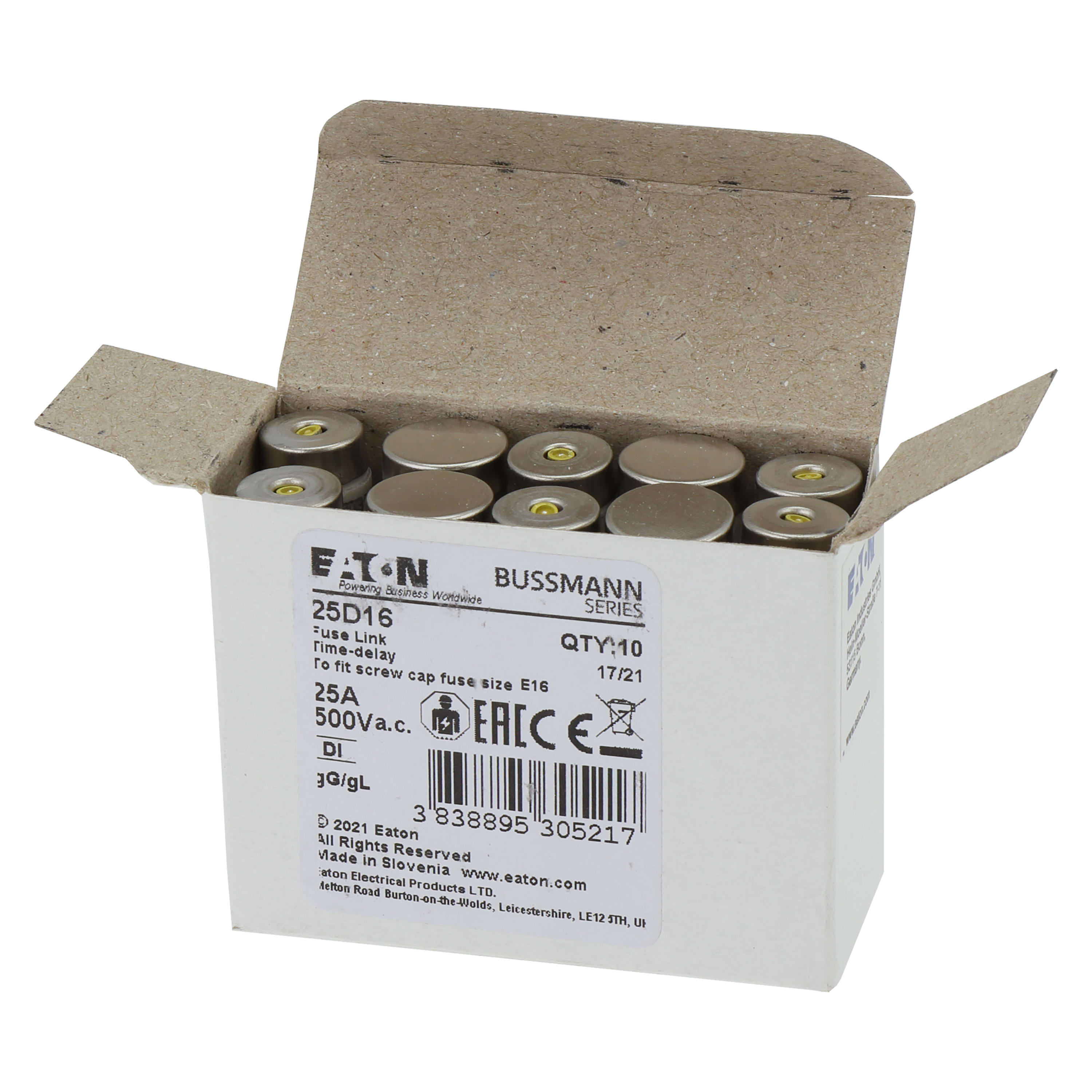 Fusibile, cartuccia fusibile, Bassa tensione, 25 A, AC 500 V, D1, gL/gG, IEC, ritardato, E16, per applicazioni domestiche e industriali generali, IEC 60269-3, VDE 0636