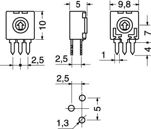 TRIMMER A STRATO DI CARBONE ACP 10x10 MONTAGGIO VERTICALE REGOLAZIONE ORIZZONTALE ROTORE CON TAGLIO. MAX POT. A 40°C:0,15 W. MAX TENS.:200 VCC. ANG. ROTAZIONE: 240° ± 5 °. TOLLERANZA:± 20%. TEMP. LAV.:-25°C÷+70°C. CURVA:lineare. PASSO:5x2,5 mm. CA9PH2.5-220KA2020.