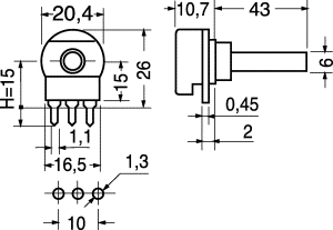 Potenziometro lineare a strato di carbone, senza interruttore • Max potenza a 40°C: 0,25W • Tolleranza: ±20% • Albero in nylon Ø 6mm • Terminali per circuito stampato • Angolo di rotazione: 130°