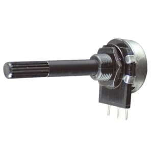 Potenziometro lineare a strato di carbone, senza interruttore • Max potenza a 40°C: 0,25W • Tolleranza: ±20% • Albero in nylon Ø 6mm • Terminali per circuito stampato • Angolo di rotazione: 130°