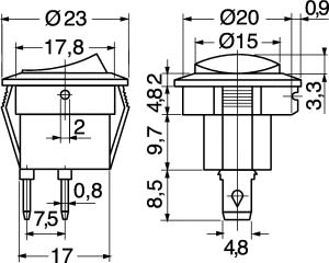 INTERRUT. BILANC. 2 POSIZ. ROSSO. PORTATA:6,5 A-250 V / 13 A-125 V. TENS. PROVA:1500 V / 1 min. CORPO:nylon rinf. vetro. CONTATTI:ottone nichel. TERMIN.:faston passo 4,80. FISSAGGIO:autobloccante. PER FASTON:4/11525. COPRIFASTON:4/11560.