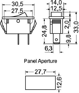 Interruttore a bilancere, corpo in abs nero, contatti in ottone, fissaggio a pannello autobloccante, terminali faston passo 6,35