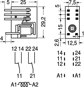 RELE' MINIATURA 2 SCAMBl. MAX CORRENTE SUI CONT.:8 A. MAX TENSIONE SUI CONT.:220 V. TEMPERATURA LAVORO:-40°C ÷ +85°C. TEMPO ECCITAZIONE:7 mS. TEMPO DISECCITAZIONE:3 mS. Resistenza: 28 KOHM.