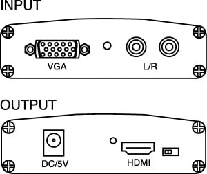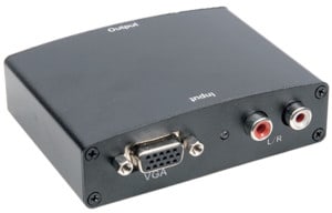 CONVERTITORE DI SEGNALE DA VGA CON AUDIO A HDMI. Permette di convertire i segnali VGA e audio in uscita dal computer ed avere la qualità garantita dallo standard HDMI per fruttare al meglio i moderni sistemi home theater. Fornito di alimentatore da 5V, facile da installare.