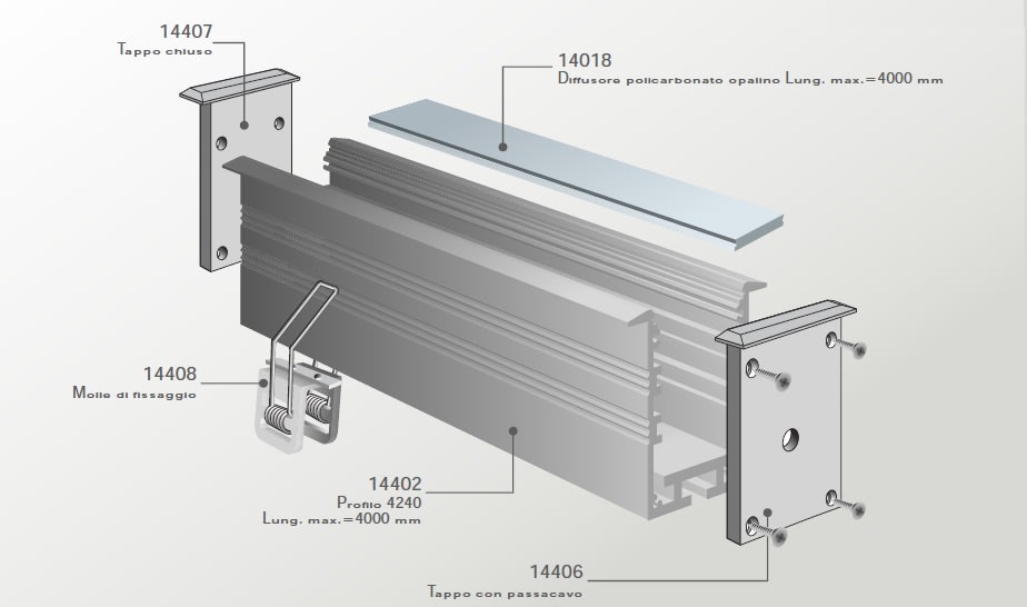 PROLINE 4240. Caratteristiche: Profilo in alluminio anodizzato. Diffusore in policarbonato trasparente o opalino resistente ai raggi UV. Profilo in alluminio completo di tappi di chiusura e molle da incasso. Finitura: Bianco. L: 2000mm.