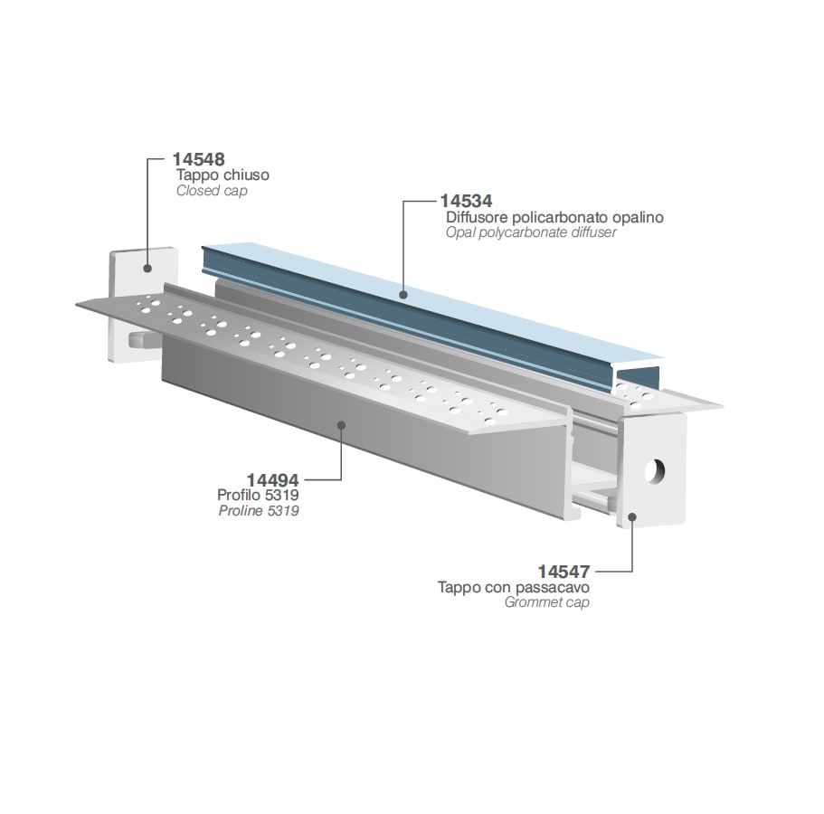 Profilo da incasso per Proline 5319 in alluminio a scomparsa totale, finitura standard alluminio anodizzato, può essere montato su cartongesso. IP20. Classe III. Lunghezza: 2000mm.