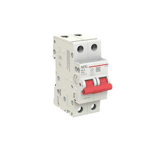 SEZIONATORE MODULARE AEG ESD, 2 POLI 2 MODULI, CORRENTE NOMINALE 40A, POTENZA DISSIPATA 5W, TENSIONE NOMINALE 415VAC / 125VDC, CATEGORIA D'IMPIEGO AC-22A DC-21A, FREQUENZA 50/60Hz, TEMPERATURA D'IMPIEGO -25/+55°C, TEMPERATURA DI STOCCAGGIO -40/+70°C