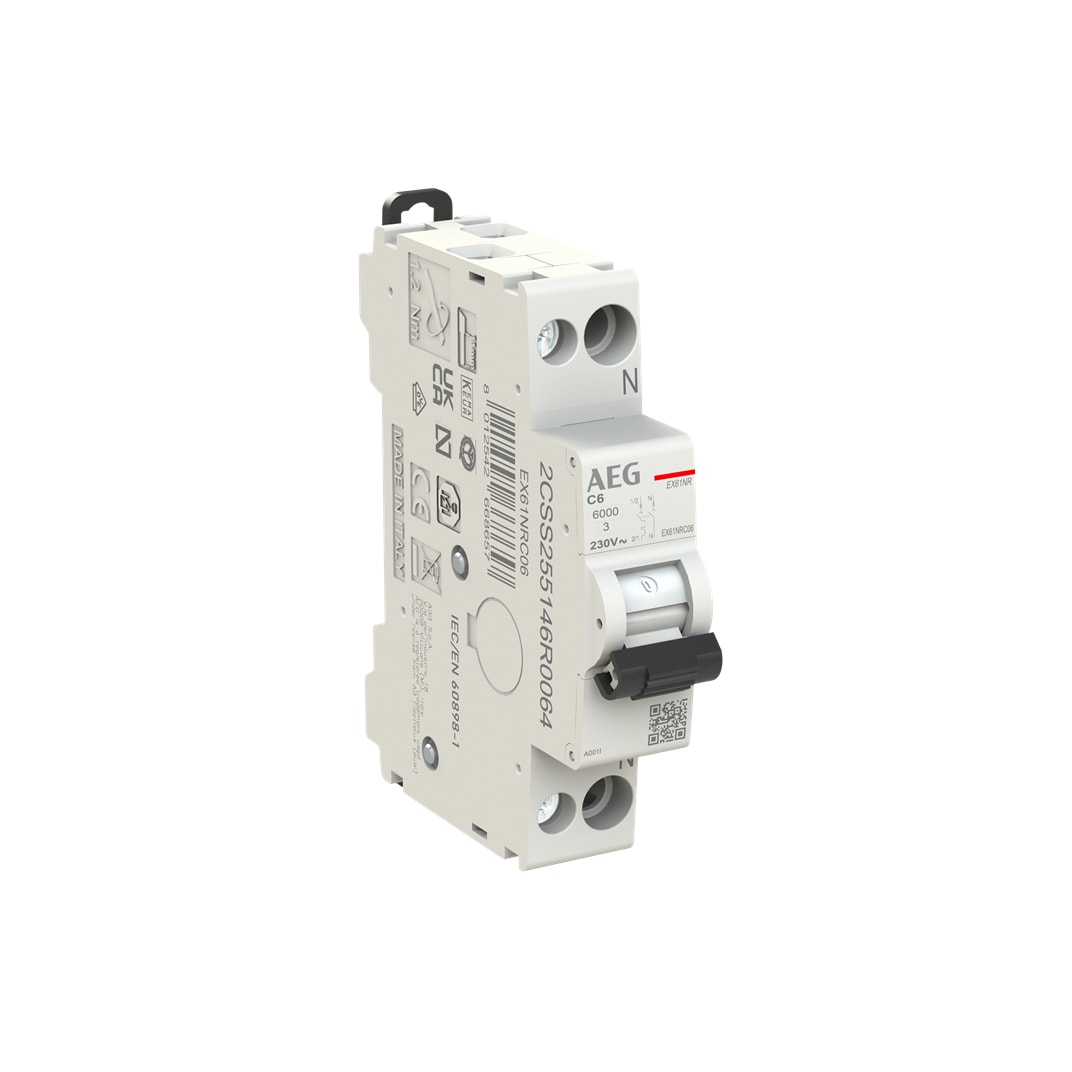 INTERRUTTORE AUTOMATICO AEG SERIE ELFANEXT, MODELLO COMPATTO EX61NR 1POLO+N IN UN MODULO, TENSIONE NOMINALE 230VAC, CORRENTE NOMINALE DA 2A A 40A, TENSIONE MINIMA-MASSIMA DI FUNZIONAMENTO 12-254V, TENSIONE DI ISOLAMENTO 500V, CURVA DI INTERVENTO DI TIPOC (5-10IN), FREQUENZA 50/60HZ, POTERE DI INTERRUZIONE 6kA SECONDO EN60898, CAPACITA' DI ROTTURA 10KA SECONDO EN60947-2, TEMPERATURA DI FUNZIONAMENTO -25/+55°C, TEMPERATURA DI STOCCAGGIO -40/+70°C, GRADO DI PROTEZIONE IP40 PER APPARECCHIO E IP20 PER I TERMINALI, VITA MECCANICA 20.000 MANOVRE, VITA ELETTRICA 10.000 MANOVRE, CAPACITA' DEI TERMINALI 10/16MM2 FLESSIBILE/RIGIDO, COPPIA DI SERRAGGIO 1,2NM, COLORE RAL 7035, POSIZIONE DI MONTAGGIO QUALSIASI