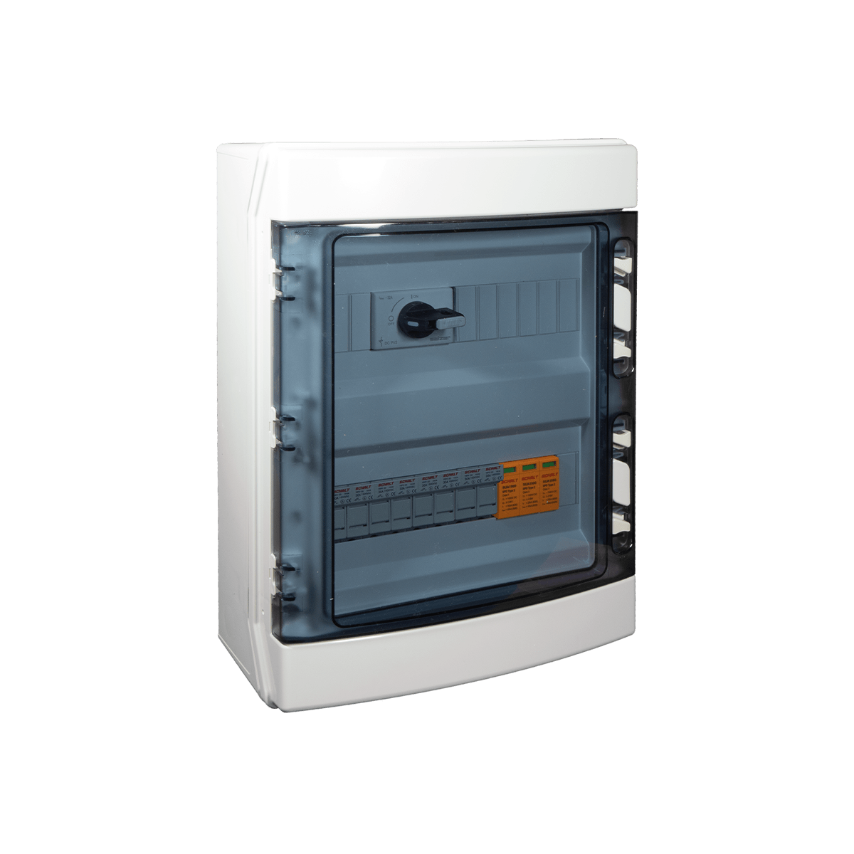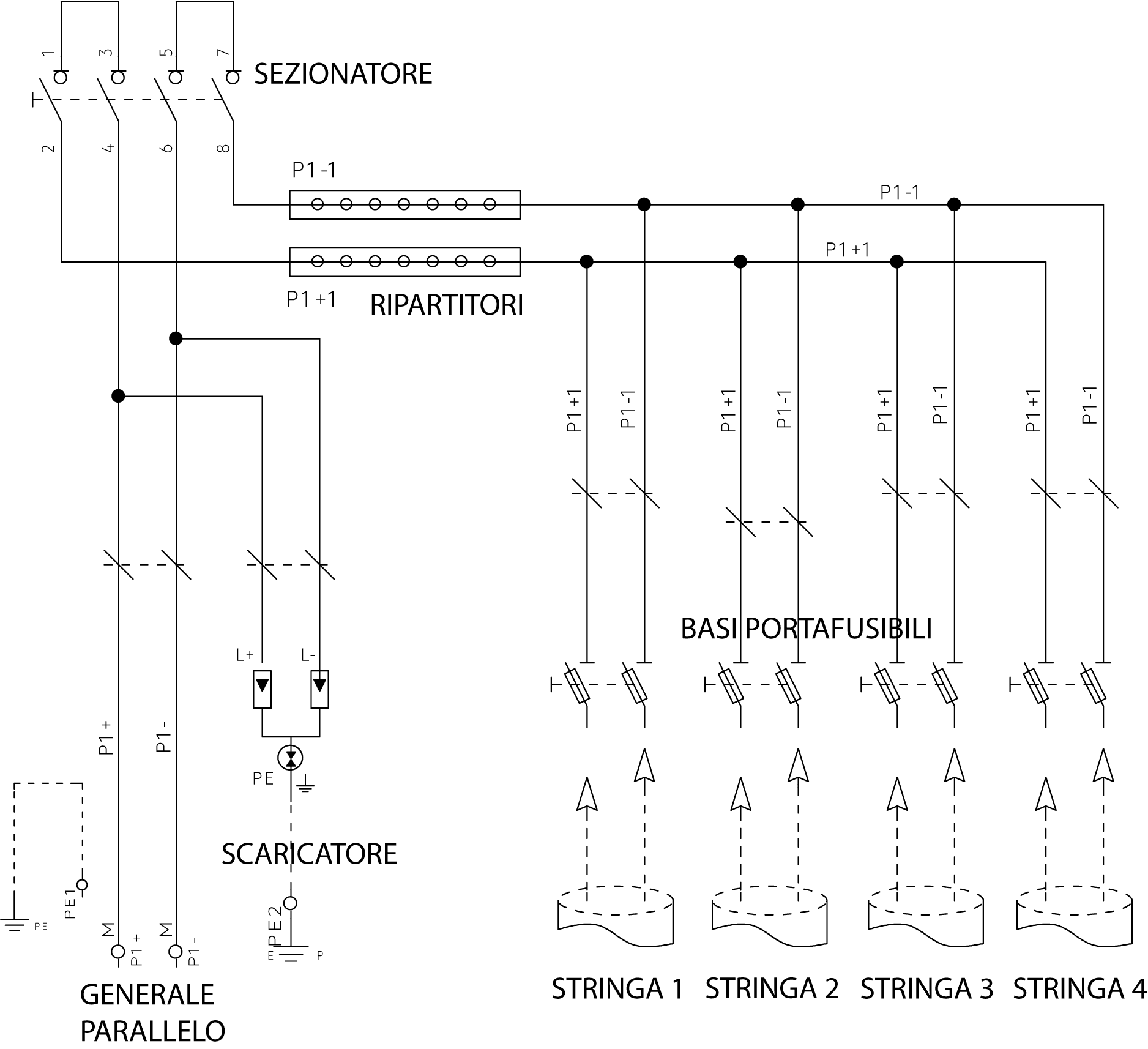 Quadro cablato di protezione stringhe per impianto fotovoltaico. 4 stringhe in ingresso e 1 in uscita fino a 1000Vdc con protezione fusibile GPV 16A in ingresso, 4 basi portafusibili 10,3x38 1000Vdc, scaricatore di sovratensione tipo 2 a 3 cartucce 1000Vdc Isn 20kA, interruttore non automatico-sezionatore 2x63A, ripartitore 175A contenitore in ABS con porta trasparente 24 moduli IP65