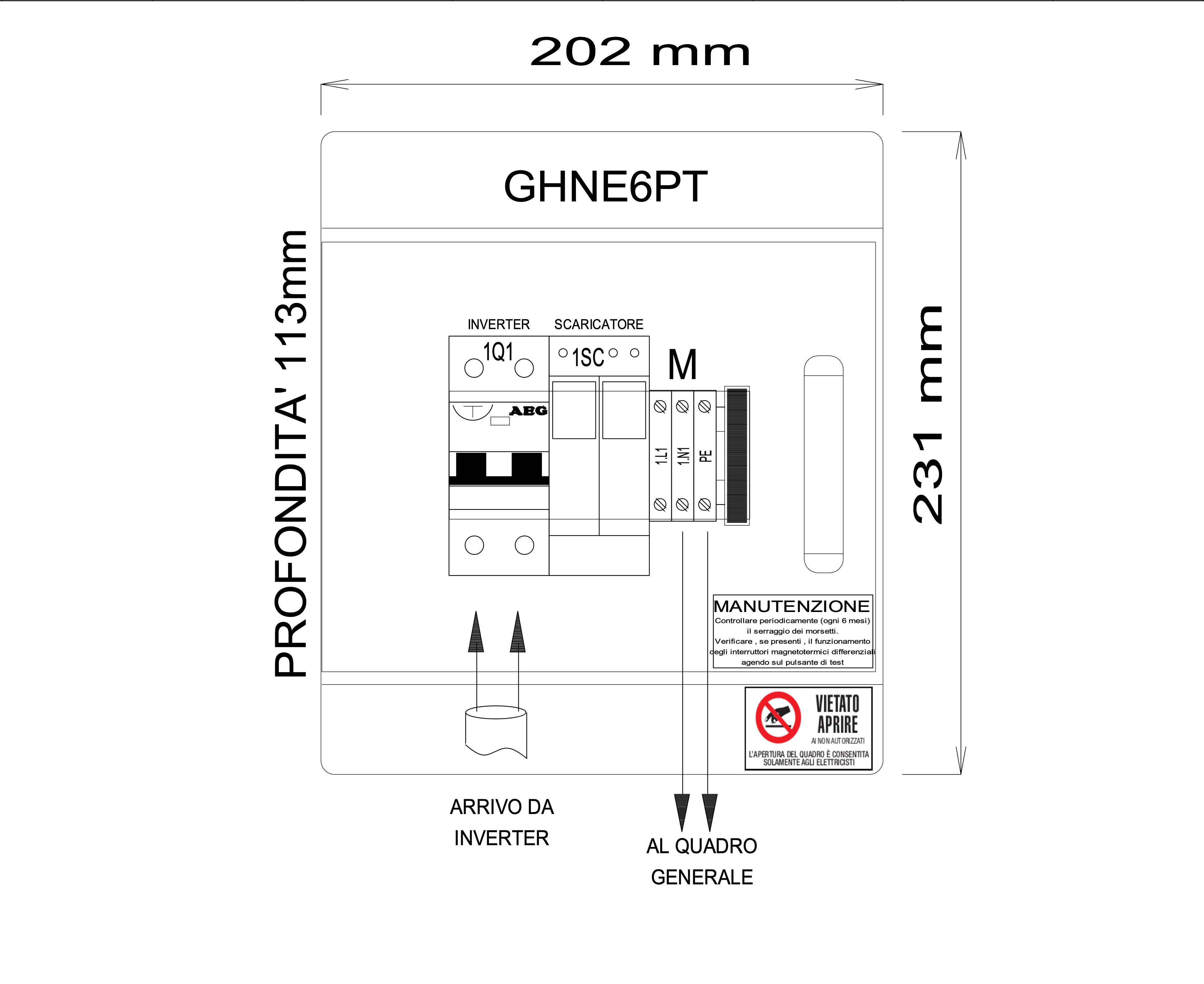 Quadro cablato AC monofase per installazione tra inverter e quadro di alimentazione. Composto da un interruttore magnetotermico differenziale in curva C da 6kA classe A da 300mA e da uno scaricatore di sovratensione di Tipo 2. La componentistica è inserita all'interno di un centralino in materiale isolante IP65 a 8 moduli.