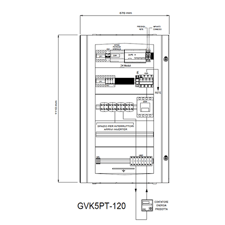 I quadri di interfaccia OPEN sono una valida soluzione per la connessione di impianti fotovoltaici CEI 0-21. I quadri OPEN nascono con lo spazio di cablaggio per gli interruttori di protezione inverter che saranno installabili successivamente tramite i collegamenti già forniti. Interruttore Generale 4x100A 50kA (EN60947-2) con bobina di sgancio per funzione di rincalzo-Relè di interfaccia NA003+Ups di emergenza (CEI 0-21)-Contattore DDI 4 poli 116A AC-3. Spazio per cablaggio Interruttori protezione inverter 3F+N:1x50kW;2x25kW (oppure 40kW+10kW o 30kW+20kW), 3x15kW, 4x12,5kW, 5x10kW-Kit di cablaggio incluso(6x35mm2 nero+2x35mm2 blu; 9x16mm2 nero+3x16mm2 blu)-Interruttori previsti 3F+N (da ordinare a parte):10kW DMA63NPC20/300;12,5kW DMA63NPC25/300;15kW DMA63NPC32/300; 20kW E94SC40+HD9532/300; 25kW E94SC50+HD9463/300;33kW E94SC63+HD9463/300;40kW E880504C80+HD94100/300;50kW E880504C100+HD94100/300. I componenti sono racchiusi in un contenitore a parete in metallo IP65 LxHxP 670x110x212mm.