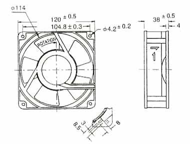 Ventilatore assiale in corrente alternate per motori a poli schermati, alta velocità, con connessione piatta serie 110 (2,8x0,5 mm). Supporto su cuscinetti a sfera. Controllo digitale PWM della velocità. Per ambienti ad alte temperature
