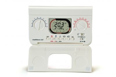 Cronotermostato elettronico a microprocessore, con programmazione settimanale per il comando di impianti di riscaldamento e di condizionamento. Portata contatti 5(3)A 250Vca.Microdisconnessione (1BU ).Contatto in commutazione libero da tensione.Alimentazione con 2 pile a stilo tipo AA da 1,5V alcaline lunga durata senza connessioni alla linea elettrica.Intellitherm C67 viene fornito con uno zoccolo adatto per il montaggio su scatole da incasso a 3 moduli, tonde o per montaggio a parete, la sporgenza dell'apparecchio è minima e l'ambientazione ancora più facilitata.Collegamento all'utilizzatore con 2 fili.Montare il cronotermostato a 1,5 metri di altezza dal pavimento, lontano da cucine, finestre, porte e fonti di calore in generale.Due pulsanti colorati,uno rosso e l'altro blu per la regolazione delle temperature di COMFORT e di ECONOMY.Un cursore per la scelta del modo di funzionamento: AUTO, COMFORT, ECONOMY, ANTIGELO.Un cursore per la scelta del tipo di funzionamento: ESTATE-INVERNO, con lo stesso cursore si può accedere alla programmazione.Due tasti per la regolazione dell'ora in corso.Tre tasti per la scelta del periodo di COMFORT, di ECONOMY e ANTIGELO.Un tasto per copiare la programmazione al giorno successivo.Un tasto per passare al giorno successivo senza copiare la programmazione.Un tasto di RESET per ripristinare il programma preimpostato.Un dip switch per selezionare il modo ANTIGELO 5°C oppure SPENTO (ON a 0°C).Possibilità di visualizzazione dei dati statistici dell'impianto: ore di funzionamento del giorno precedente e dall'inizio del funzionamento dell'apparecchio, temperatura minima e massima del giorno precedente e l'ora in cui viene misurata.Possibilità di sapere per quante ore è stato "richiesto calore"(relè chiuso - ON) il giorno precedente e dall'inserimento delle pile o da un reset dell'apparecchio.